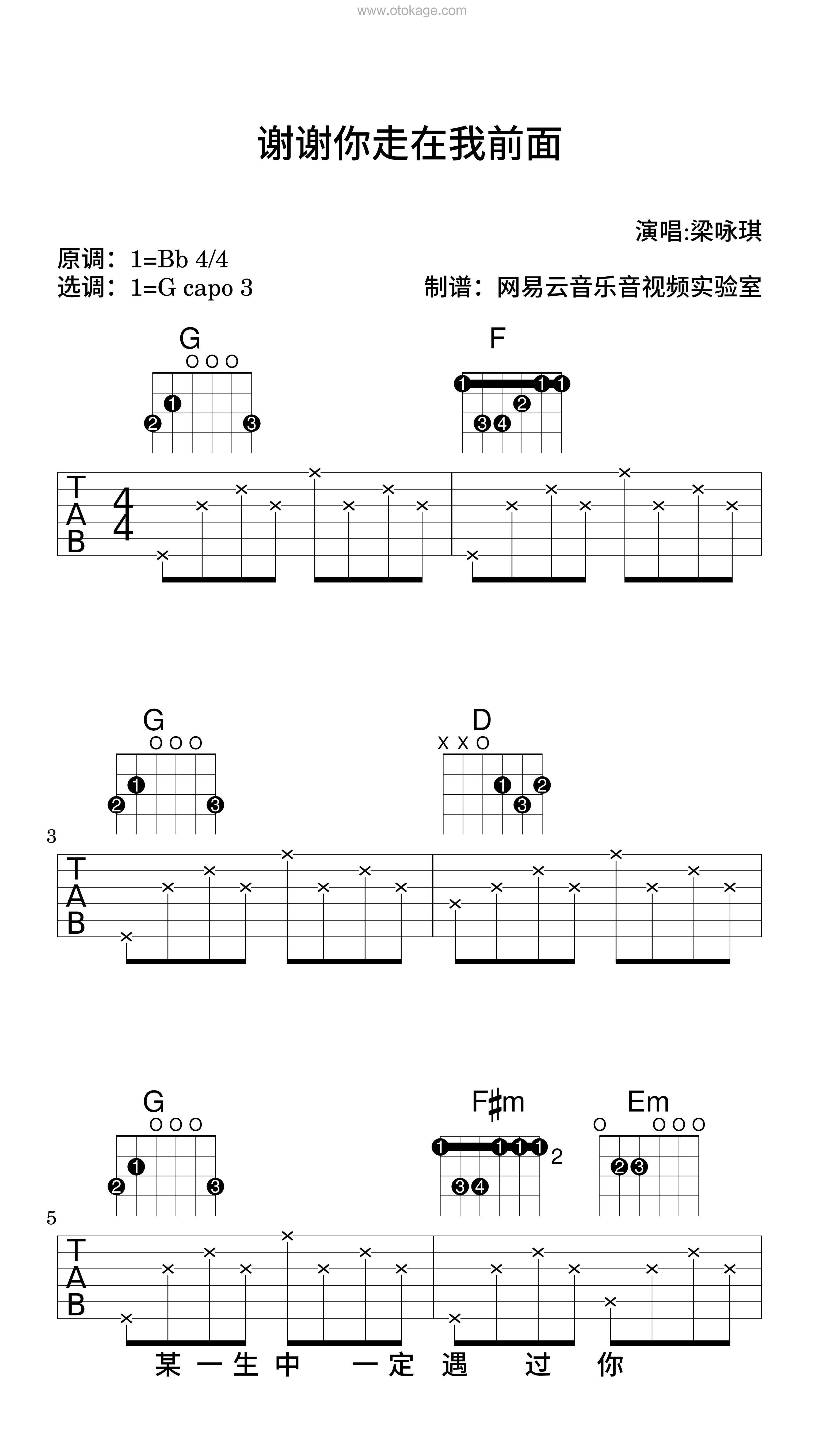《谢谢你走在我前面》是一首深情的歌,由梁咏琪与唐书琛共同填词,卢冠廷作曲。歌曲以温柔细腻的笔触,描绘了一段默默守护、无私奉献的爱情故事。歌词中的“你”不仅代表了一个具体的恋人,也可以理解为生命中任何给予我们支持和鼓励的人。通过“谢谢你走在我的前面”,表达了对这份陪伴与引导的感激之情。 歌曲开篇便提到,在人生的某个阶段,总会遇到这样一个人,虽然可能没有足够的时间去表达感谢,但对方却愿意为了自己付出一切,甚至死心塌地地厮守。这种爱是沉默而坚定的,它让原本觉得遥不可及的光明变得触手可及。 副歌部分反复强调了“有你带路,不再孤独”,形象地描述了在对方的带领下,即使面对未知的命运和挑战,也能勇敢前行,感受到生活的美好。最后一段更是升华了主题,指出即便是在离别的时刻,心中依然保留着对方带来的温暖记忆,闭上眼睛就能看到那些最美的风景。整首歌充满了正能量,传递出珍惜眼前人、感恩生活的积极态度。