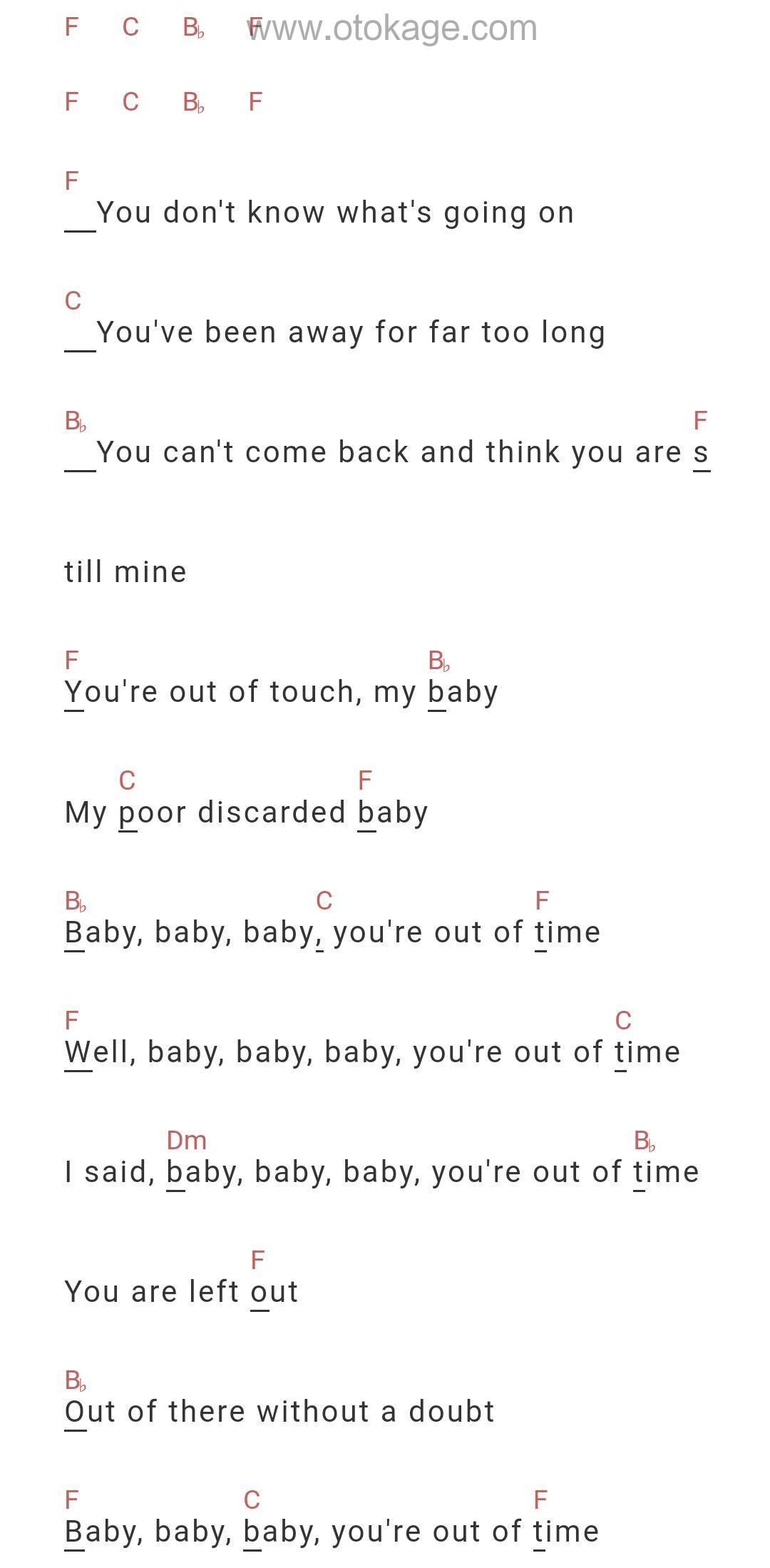 《Out Of Time》是一首由Joyside乐队演绎的摇滚曲目,其歌词充满了情感的张力和时间流逝的无奈。歌曲讲述了一段关系中的疏远与决裂,主角似乎是在对曾经亲密无间的伴侣表达一种彻底的失望与放手。歌词中反复出现的“you're out of time”不仅强调了时间的无情流逝,也暗示了两人之间的情感联系已经无法挽回。歌中的“baby”被描绘成一个脱离现实、试图重新回到过去的人,但一切都已物是人非。整首歌通过强烈的节奏和重复的旋律,传达了一种无法逆转的失落感,同时也反映了现代人在快速变化的社会中常常面临的疏离感和无力感。