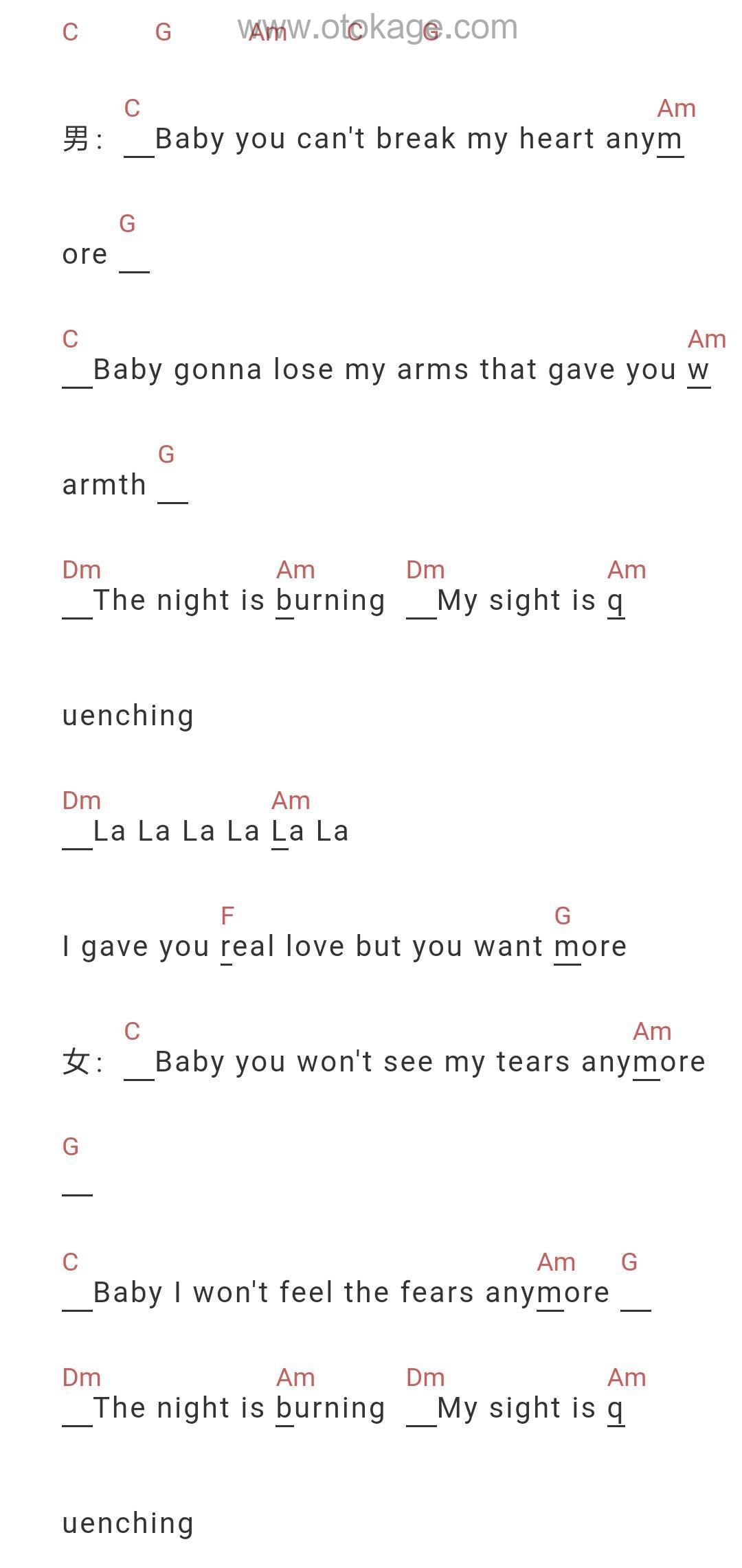 《Dong Dong Dong》是一首充满情感张力的摇滚曲目,由Joyside乐队演唱。歌曲以一种决绝而哀伤的语气展开,讲述了一段破裂的爱情关系。主歌部分反复强调“baby you can't break my heart anymore”,表达了主人公对过去情感的放手和对未来的坚定。尽管曾经给予对方真挚的爱,但对方似乎总是想要更多,这种无尽的需求最终导致了关系的破裂。 副歌部分通过“the night is burning, my sight is quenching”这样的意象,描绘了一种内心的煎熬与挣扎。夜晚的燃烧象征着内心的痛苦与不安,而视线的干涸则暗示了泪水的枯竭,表明主人公已经不再为这段感情流泪。 歌曲的结尾部分,“can you feel my love from this wasted heart”反复出现,表达了即使心已疲惫不堪,依然希望对方能够感受到那份深藏的爱。最后的“oh the stars, don't you shine so bright / don't twinge my eyes”则进一步强化了这种孤独与无奈,星星虽然明亮,却无法照亮内心的黑暗,世界依然显得古老而陌生。 整首歌曲通过强烈的节奏和深情的歌词,传达了一种既痛苦又坚定的情感态度,展现了爱情中的复杂与矛盾。
