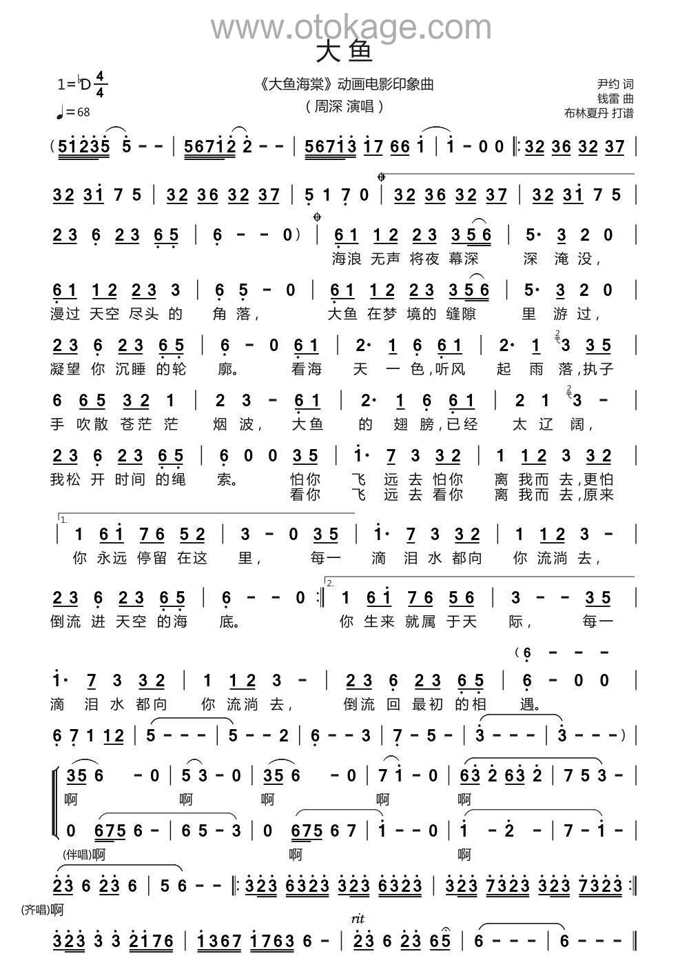 《大鱼》是一首充满梦幻与深情的歌曲,它以海洋、天空和大鱼为意象,构建了一个广阔而神秘的世界。在这首歌中,大鱼象征着自由与梦想,同时也代表着一种难以割舍的情感纽带。歌词中的“海浪无声将夜幕深深淹没”描绘了一幅宁静而深远的画面,暗示着情感的深沉与不可言说。大鱼在“梦境的缝隙里游过”,仿佛是在寻找某种失去的东西,或是追寻着内心深处的梦想。 “看海天一色 听风起雨落”则表现了自然界的和谐与美丽,同时也隐喻着人与自然之间的密切联系。“执子手 吹散苍茫茫烟波”表达了对爱情的渴望与执着,希望与爱人共同面对生活的风雨。“大鱼的翅膀 已经太辽阔 我松开时间的绳索”则传达出一种放手与释怀的态度,虽然心中有不舍,但最终选择让对方自由飞翔。 整首歌曲通过这些富有诗意的意象,表达了一种对美好事物的向往与追求,以及在面对离别时的无奈与释然。周深清澈空灵的嗓音更是为这首歌增添了几分神秘与梦幻的色彩,让人沉浸其中,感受到一种超越现实的美好。