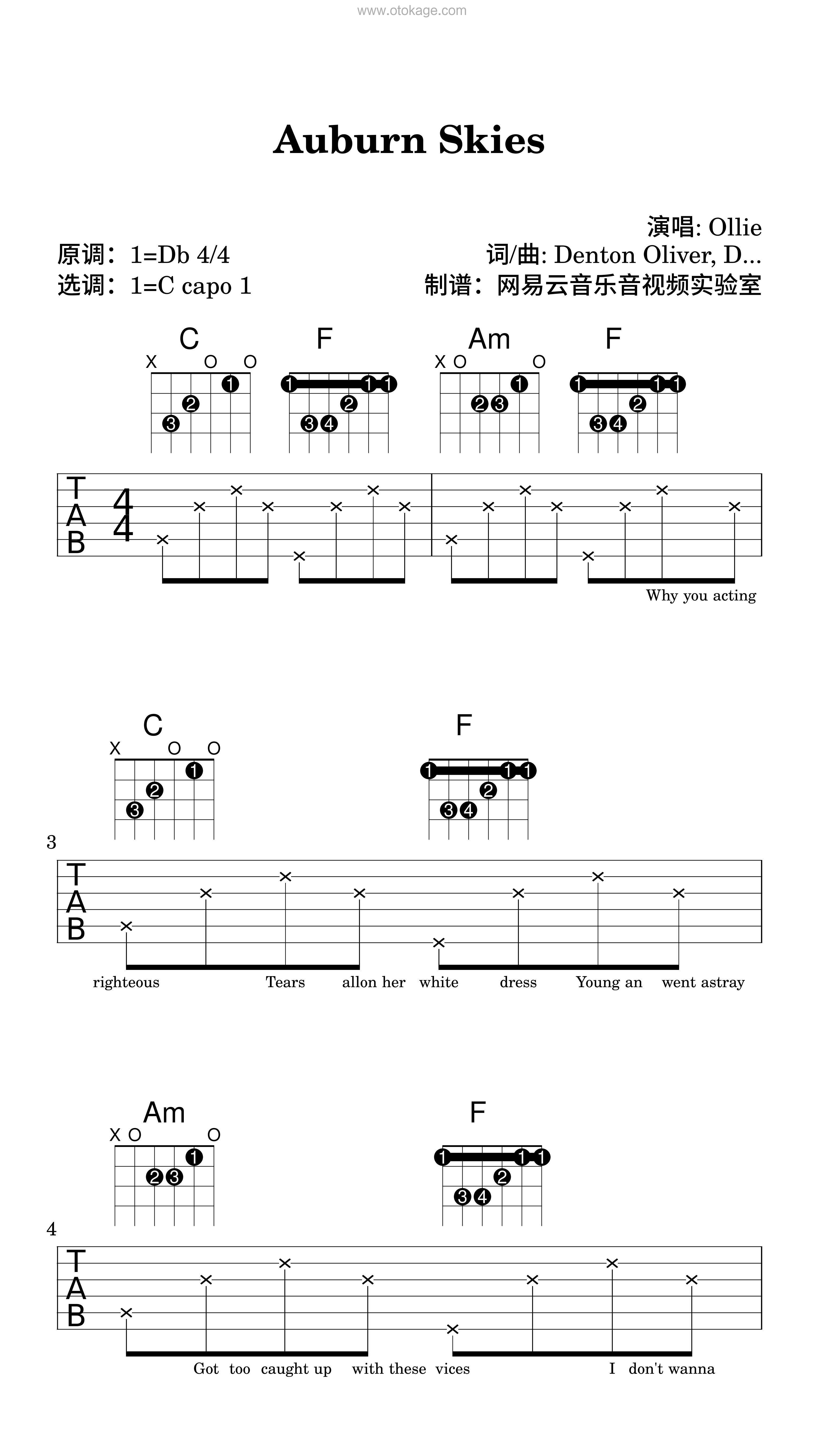 歌曲《Auburn Skies》由Ollie演唱,歌词深刻描绘了内心挣扎与情感创伤。整首歌围绕着悔恨、迷失与对过往记忆的无法释怀展开。“auburn skies”(赤褐色的天空)作为核心意象,象征着模糊而沉重的记忆,充满忧郁与遗憾。主人公反思自己年少轻狂时沉溺恶习、误入歧途,同时面对他人虚伪的“正义指责”感到愤怒与不解。他渴望活下去,不愿英年早逝,却深陷痛苦循环之中,被罪恶感和往事反复折磨。“血染双手”与“天空变红”强化了内疚与心理崩溃的氛围。全曲通过不断重复的歌词,表现出思维的困顿与情感的执念,传达出在自我谴责与求生欲望之间摇摆的复杂心境,是一首关于成长伤痛与精神救赎的深情独白。